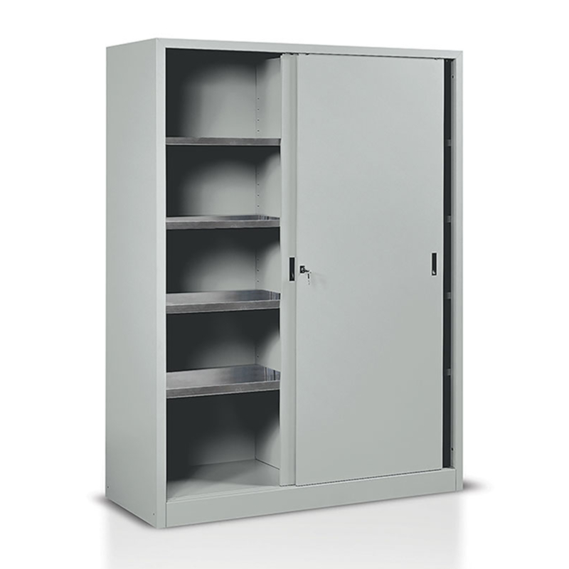 Gli armadi sono realizzati in lamiera di acciaio con bordi arrotondati raggio di curvatura 6 mm, e verniciati ad alta temperatura con polveri epossidiche termoindurenti.Ante battenti: in lamiera, corredate di cerniere interne.Maniglia con serratura a timone che in rotazione inserisce verticalmente d