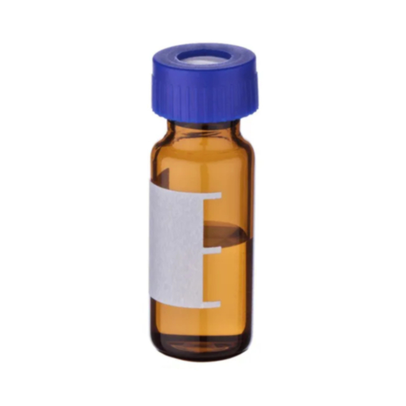 Kit Vials Vetro - Collo a Vite - 9-425 - Ambrato - ml 2 - Ø 12x32 mm - pz 100 Zona di Scrittura - con Tappo Forato PP Blu e Setto - Silicone/PTFE
